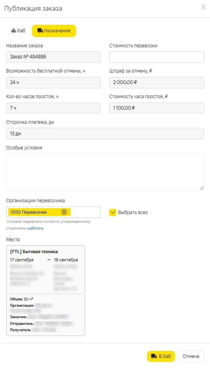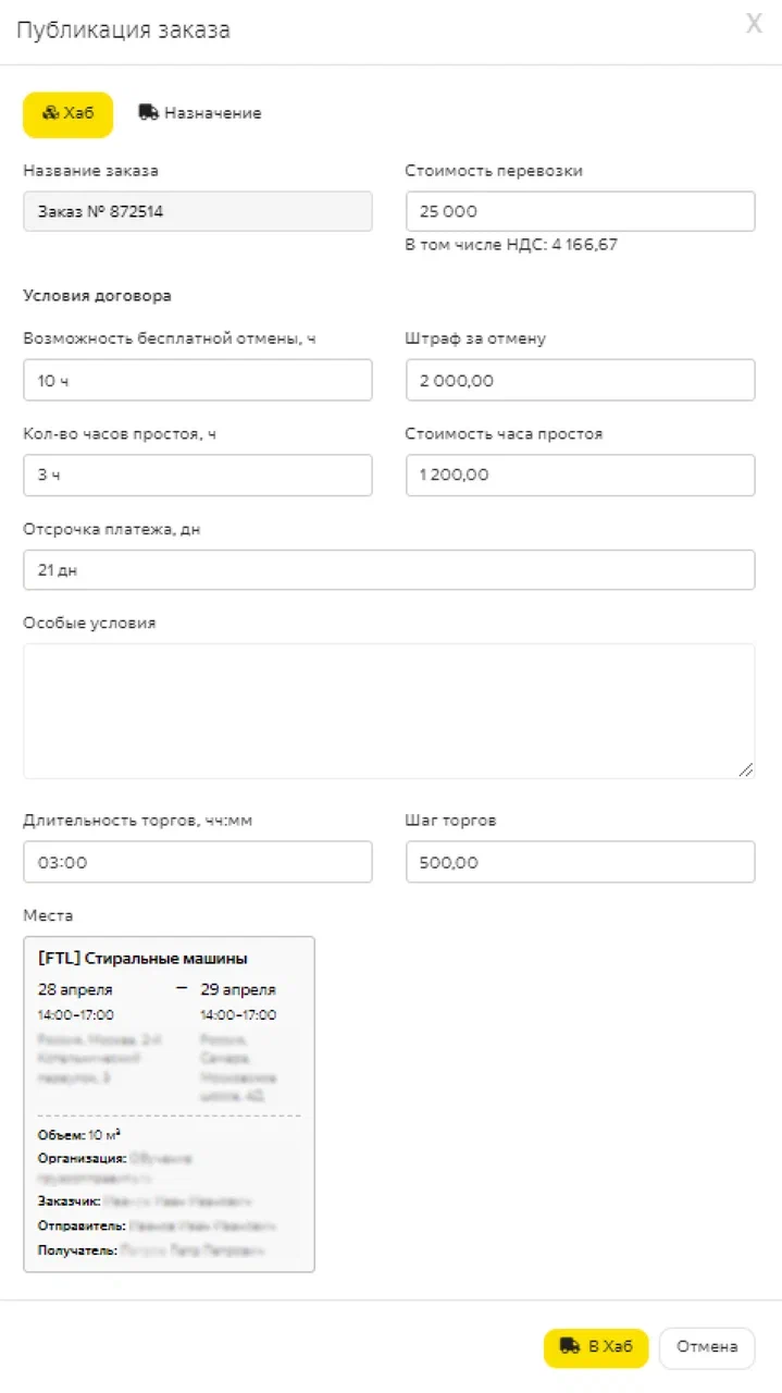 Чтобы разместить заказ, заполните все необходимые поля карточки и нажмите кнопку В Хаб.