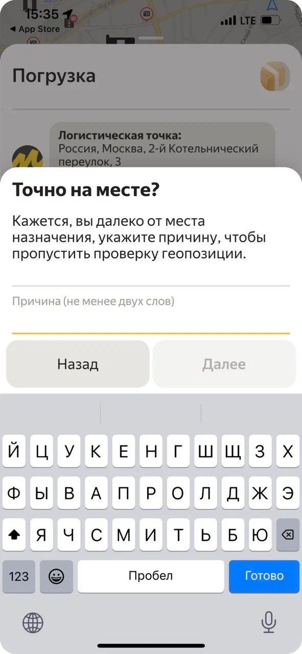 Если на телефоне не включена геолокация или у приложения нет доступа к геолокации телефона, то при прибытии на погрузку появится окно с вопросом Точно на месте?. Ответьте на вопрос и нажмите Далее.