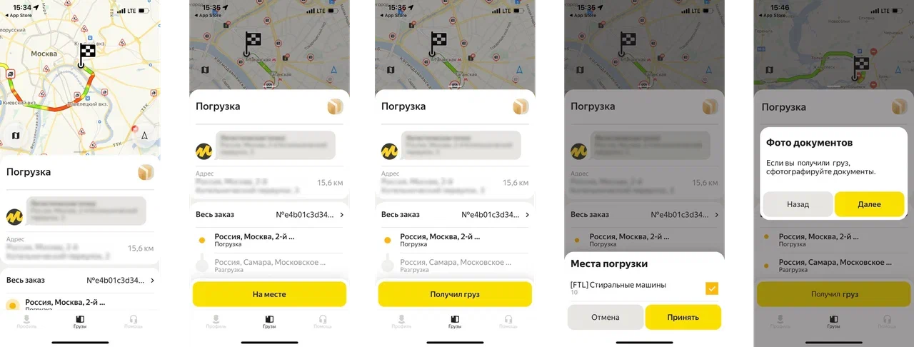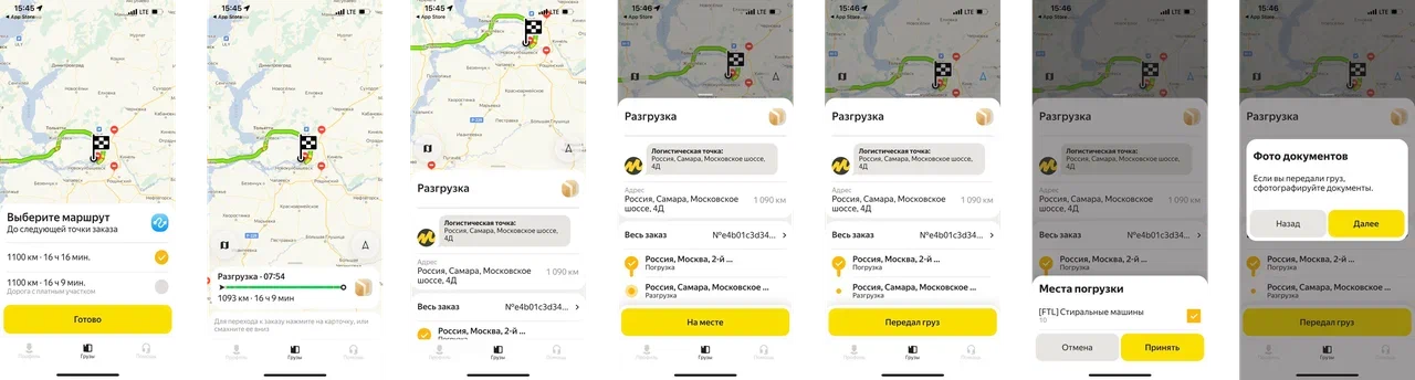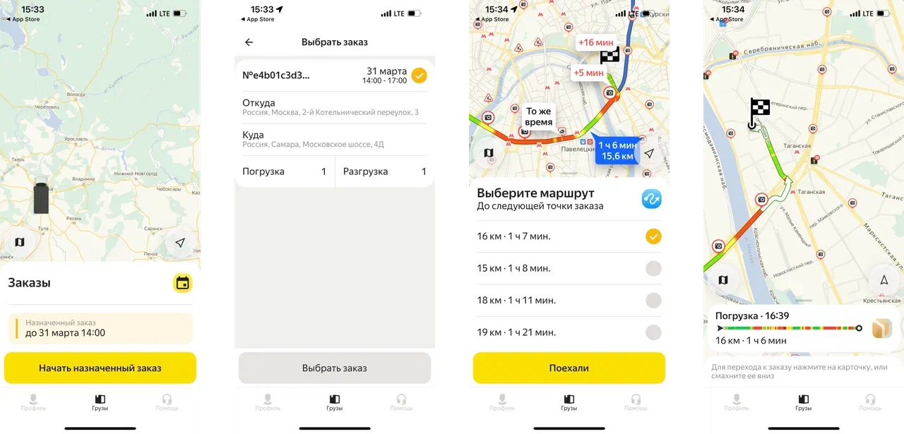 Изучите возможные маршруты. Поставьте отметку рядом с выбранным маршрутом до следующей точки заказа и нажмите Поехали. Приложение построит выбранный вами маршрут и рассчитает примерное время в пути до первой точки погрузки.