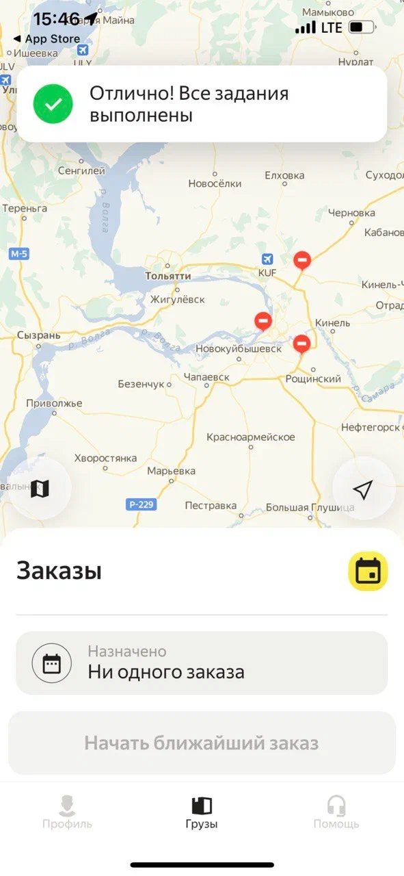 Когда рейс завершен и нет других заказов, на экране приложения появится сообщение: «Отлично! Все задания выполнены».