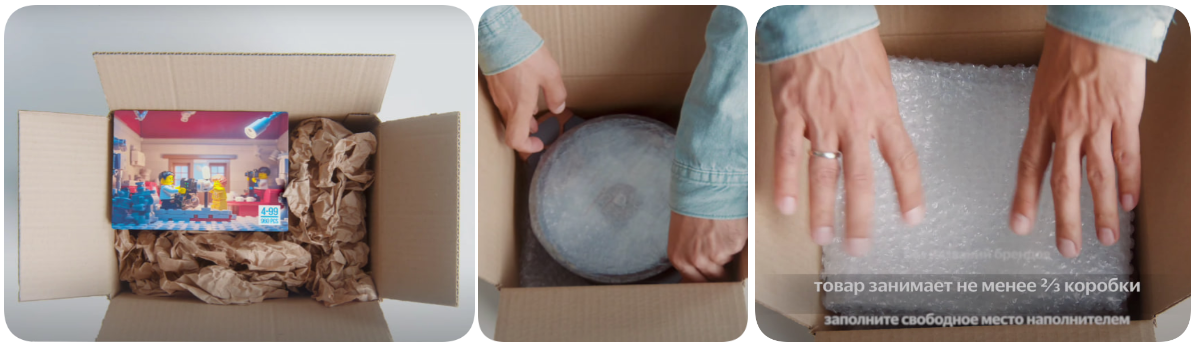 Размер упаковки должен соответствовать габаритам товаров. Например, упаковка не должна быть полупустой. Так она может деформироваться, а товары — повредиться.