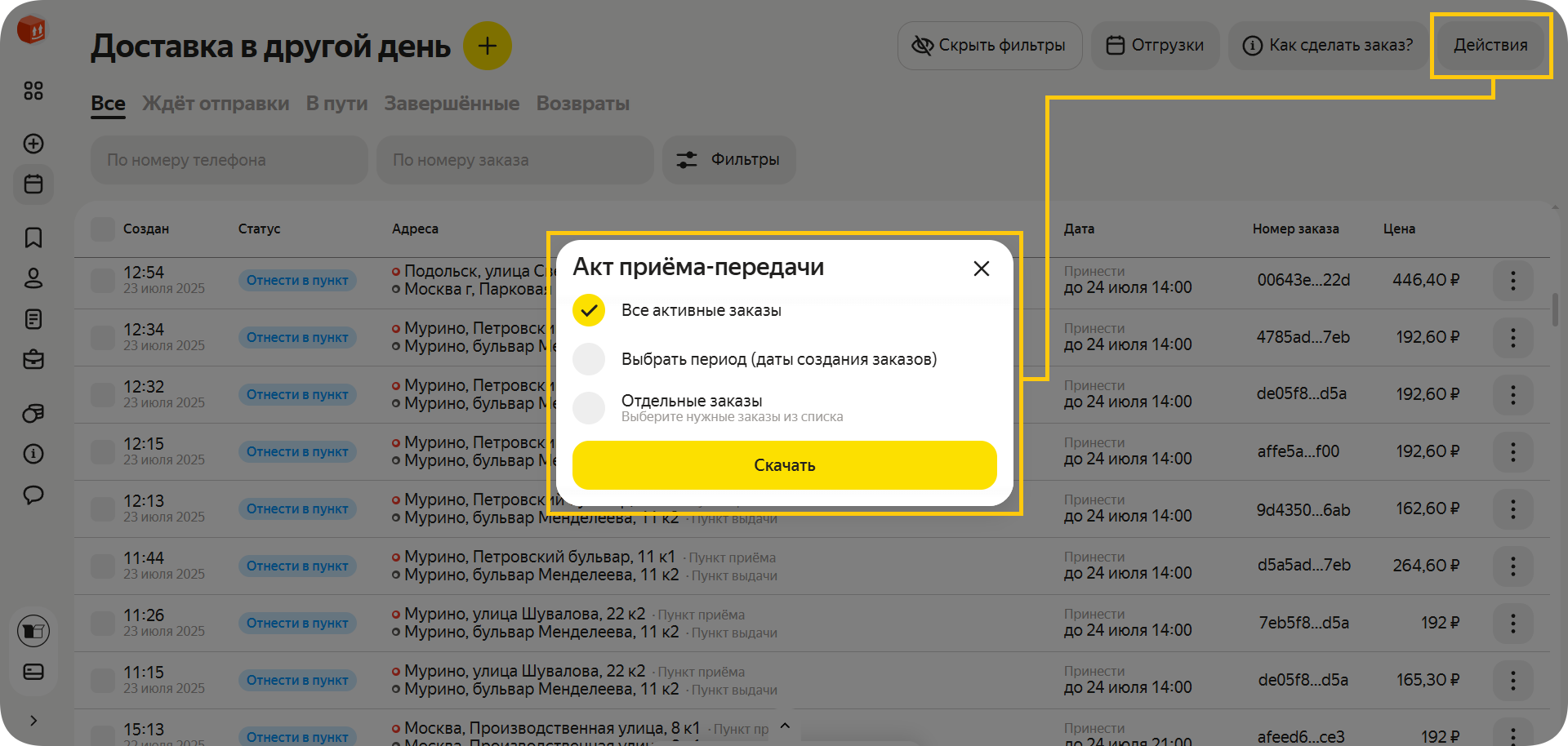 Чтобы скачать акт приема-передачи, перейдите в раздел Доставка в другой день, нажмите Действия → Скачать акт приема-передачи.