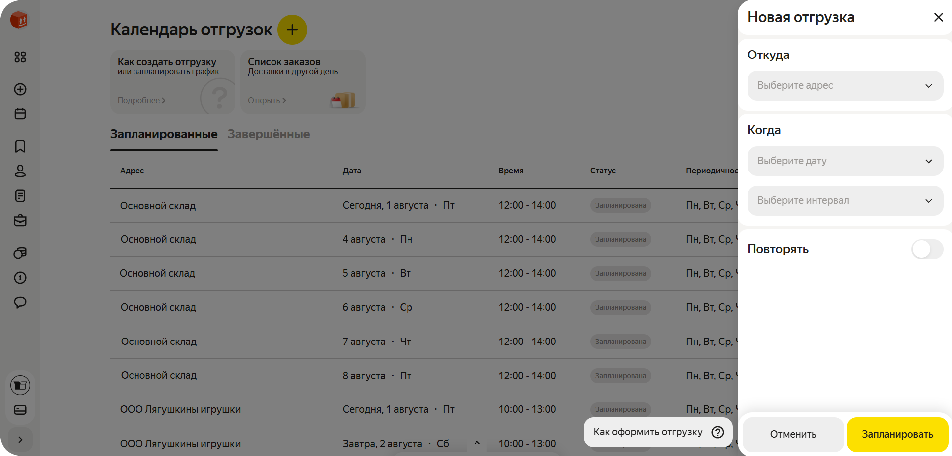 С помощью инструмента Календарь отгрузок вы можете отправить заявку на одноразовую, многоразовую или регулярную отгрузку курьером.