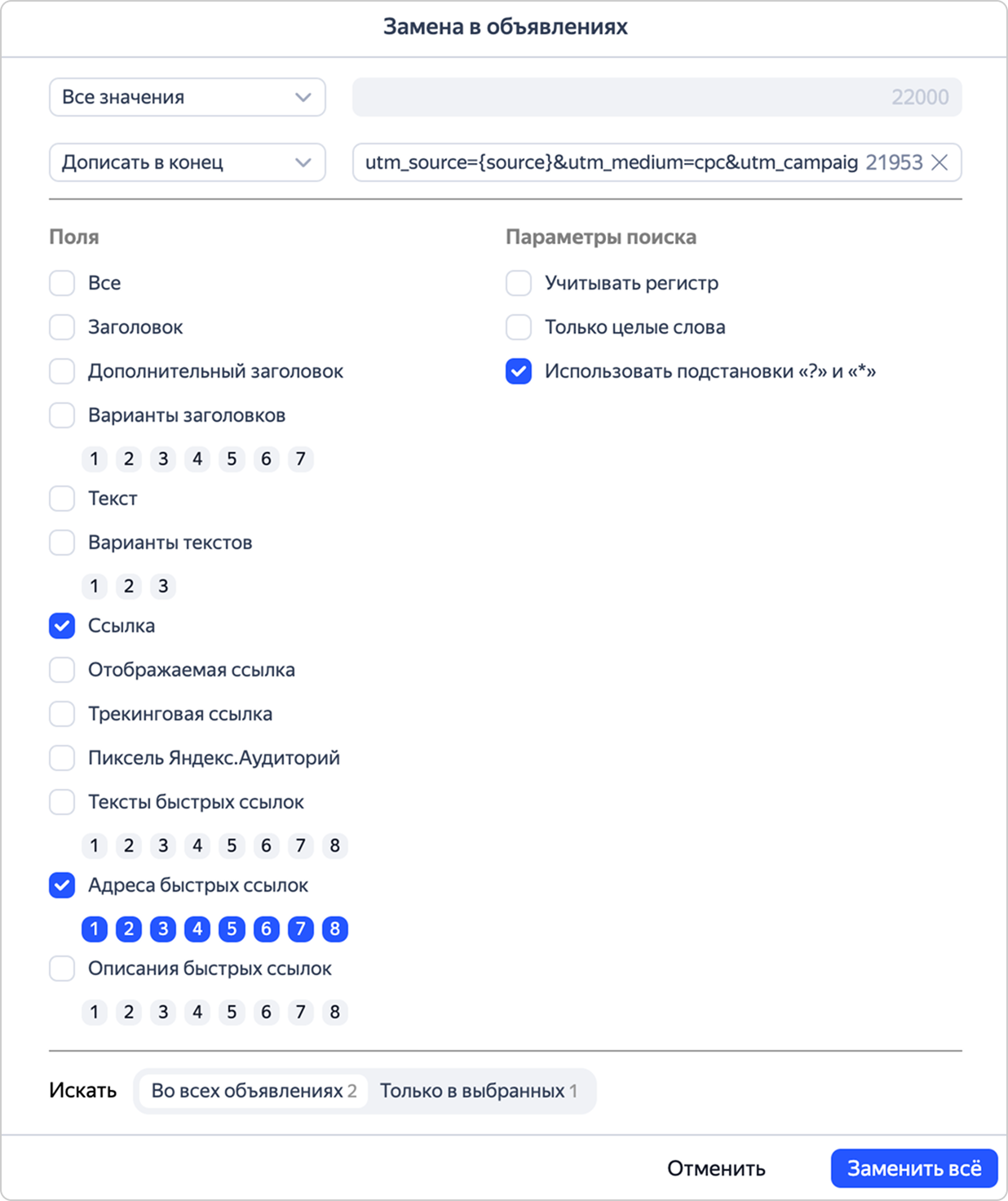 In the Replace in ads window, specify the replacement parameters and click Apply.
