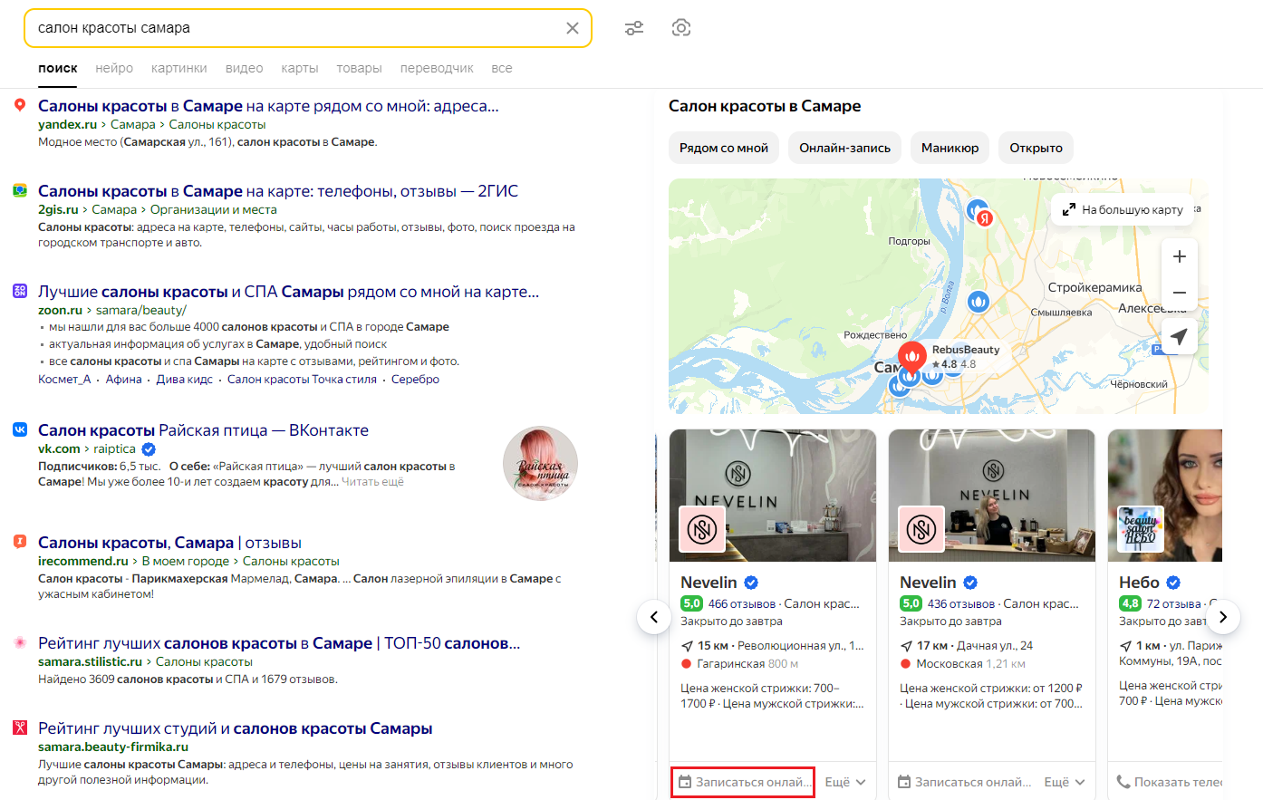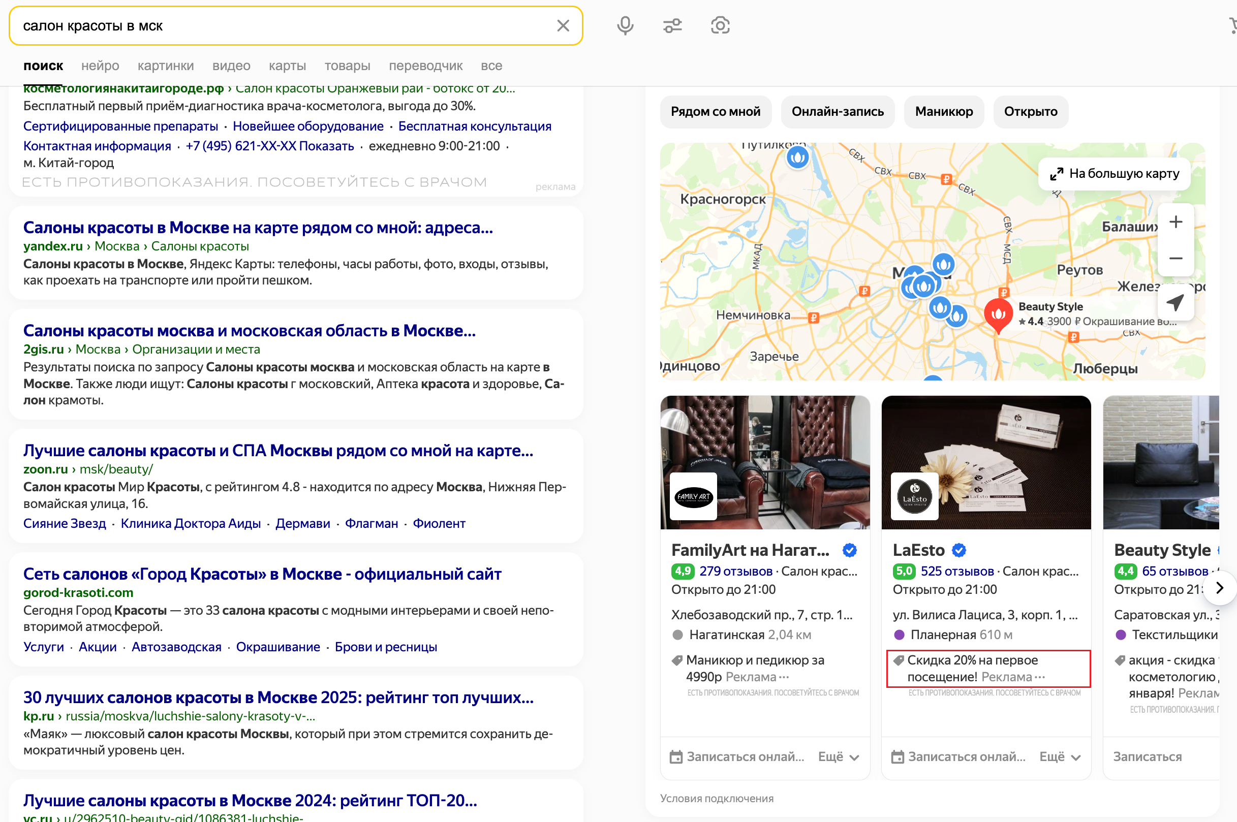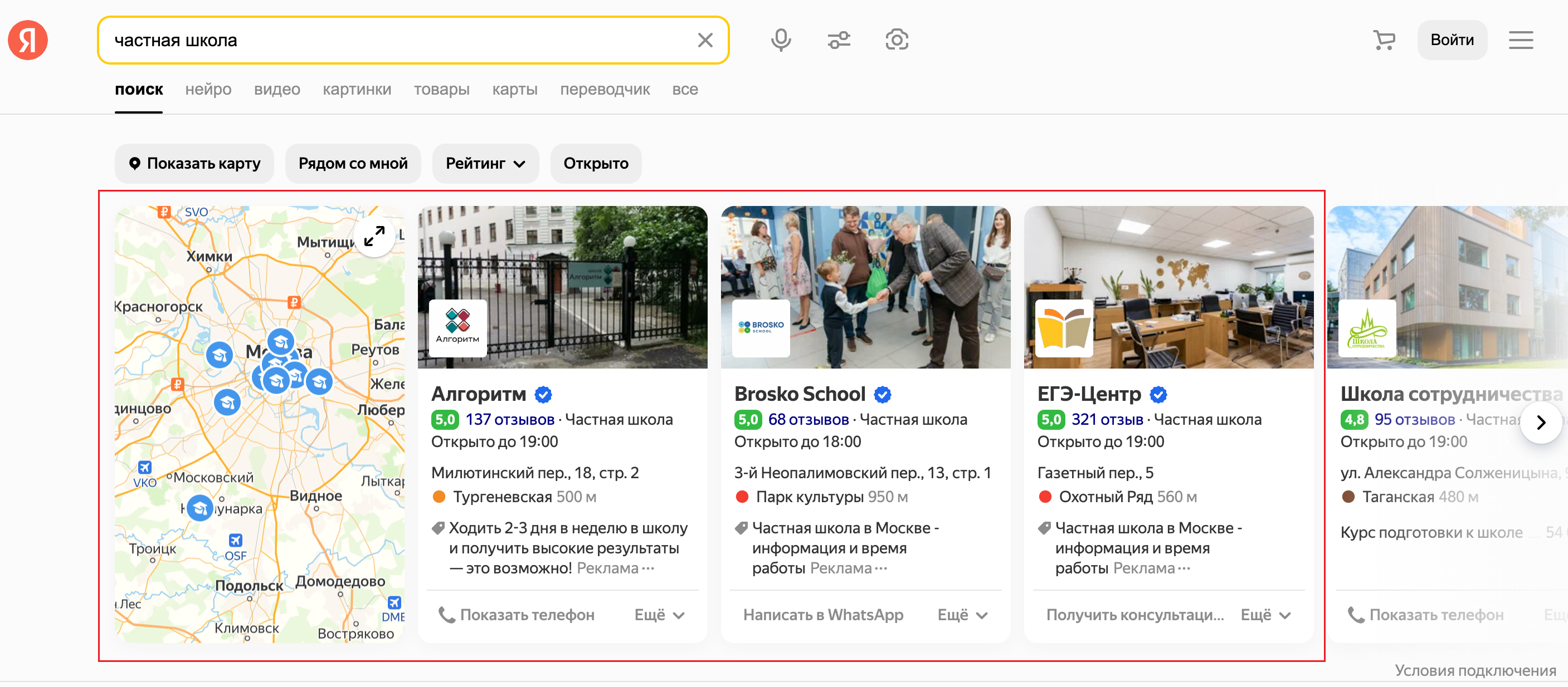 When users search for information about a location in Yandex Search, they see profiles of companies that match the query and operate in their region — they appear under the search bar or to the right of the search results. Your organization profile may be featured in special positions among similar companies. This way, users who are already looking for places to go to or services similar to yours are more likely to choose you, open your organization profile, call you, or visit right away.