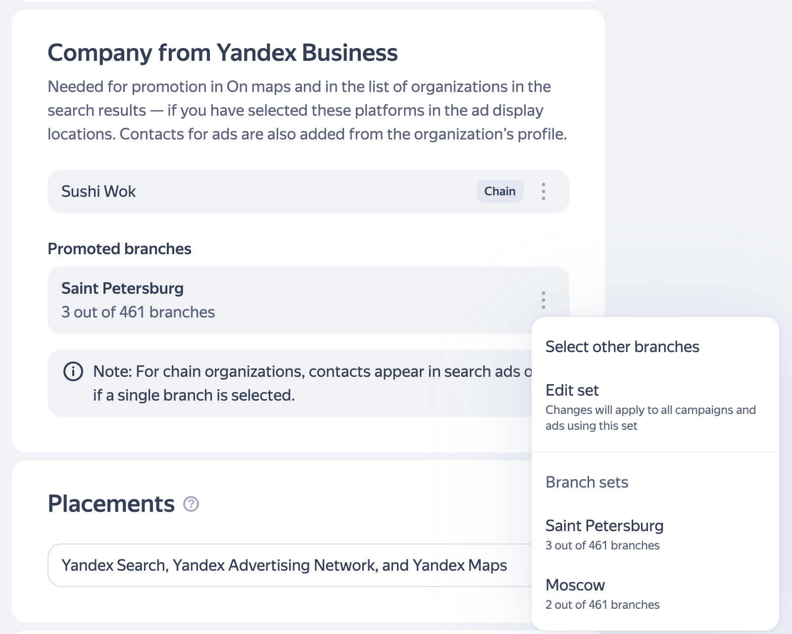 Under Placements, leave the default value Yandex Search, Yandex Advertising Network, and Yandex Maps or select Manual setup → Yandex Maps and/or List of organizations in search results.