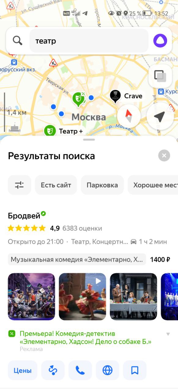 Company labels appear in Yandex Maps during searches. For organizations without promotions, the label is blue. Labels of companies promoted in Yandex Maps are shown in green when the ad wins the auction. Green labels are larger and brighter, making your organization stand out among others. Even when zoomed out, the green label remains visible, capturing user attention and helping potential customers remember its location.