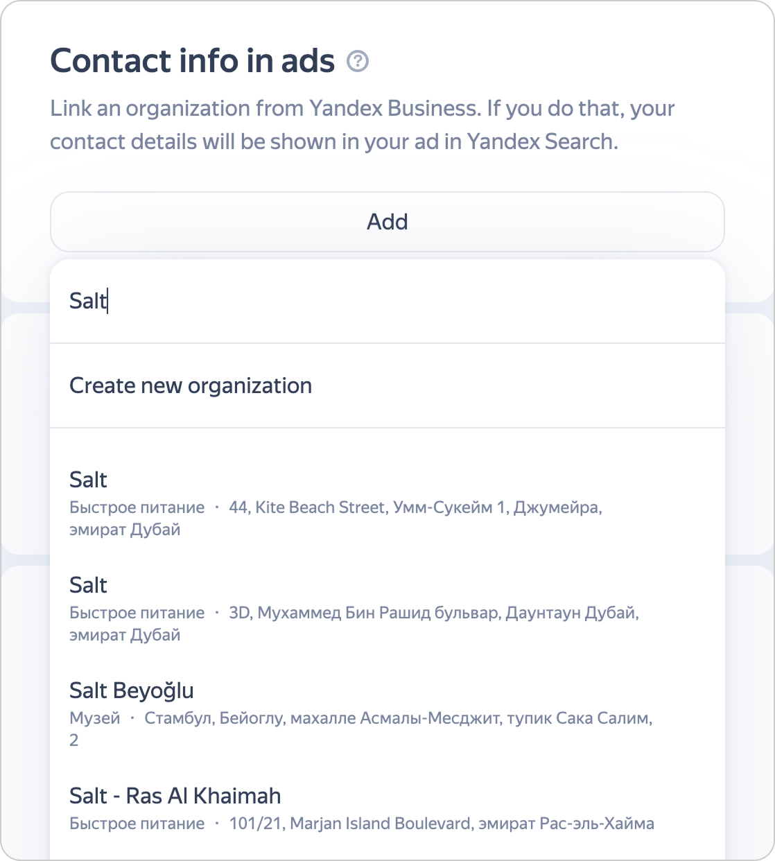 Contact info help your ads stand out from the competition and makes it easier for customers to reach you. You can link an organization from Yandex Business in the contact info.
