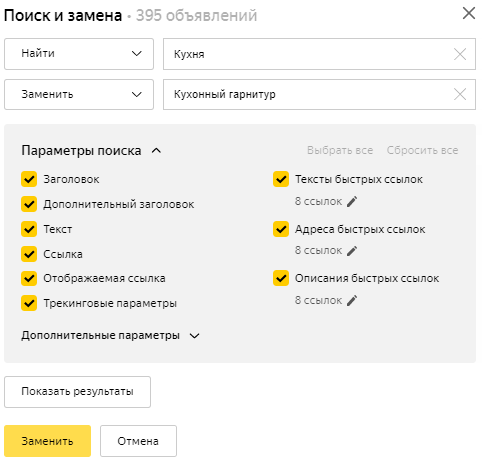 You can make changes in all the selected ads without searching for the fragment. To do this, instead of Search, choose Select all fields in the drop-down list. To delete all the found fragments, choose Clear.