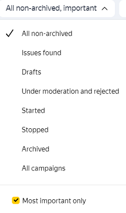 To view the list of important campaigns, open the filter by campaign status and choose Most important only.