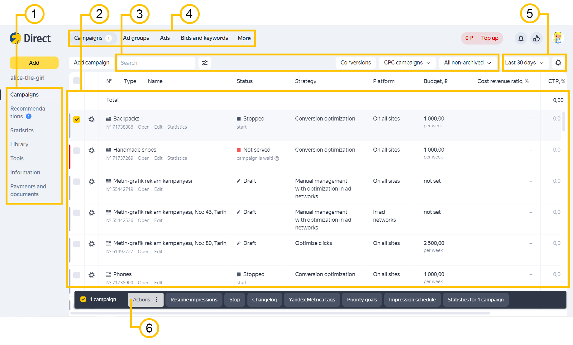 In the new interface, all data for your campaigns, groups, and ads is shown in the same window. See the main elements below.