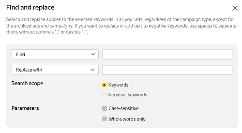 To replace keywords, select them in the Bids and keywords tab and click Find and replace or Actions → Find and replace.