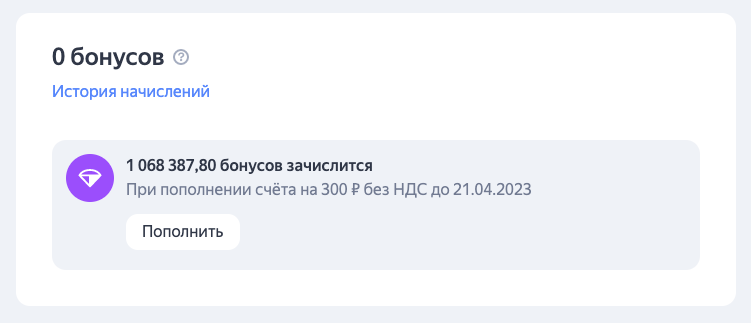 The amount of bonuses earned during the previous period, including all offers. The statistics are updated before the 10th calendar day of each month. To activate bonuses and start using them to pay for your advertising campaigns, top up your account before the specified date.