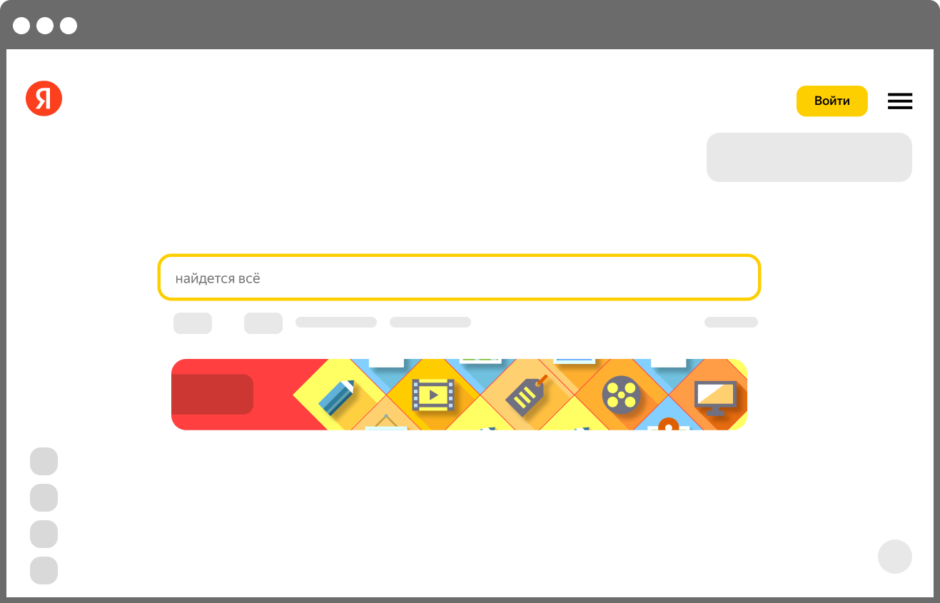 An auction-based banner under the search bar, paid per impression. You can place this display banner in the full and mobile versions of ya.ru, on a new Yandex Browser tab, and on the Yandex Advertising Network sites. This can help you improve your brand awareness, increase customer loyalty and interest in the brand, and expand your reach. Payment is per 1000 impressions.