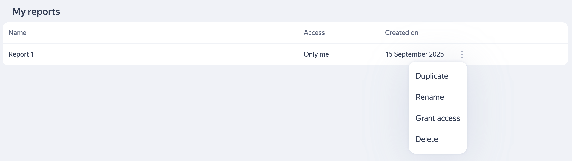 To view and edit saved reports, go to the left menu and select Statistics → My reports. To duplicate, rename, or delete a report, click