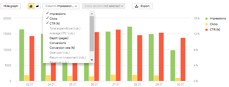 The graph can only compare data for two types of measurements. For example, quantitative indicators such as Impressions, Clicks and Average CPC. The second scale is added to the graph automatically when selecting an indicator from another group of measurements. In this case, data from the third group will be unavailable to input on the graph.