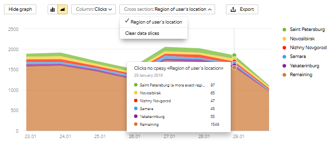 If you are studying statistics for a long time period, the data may not always appear in a histogram. In this case, Yandex Direct will by default create a line graph.