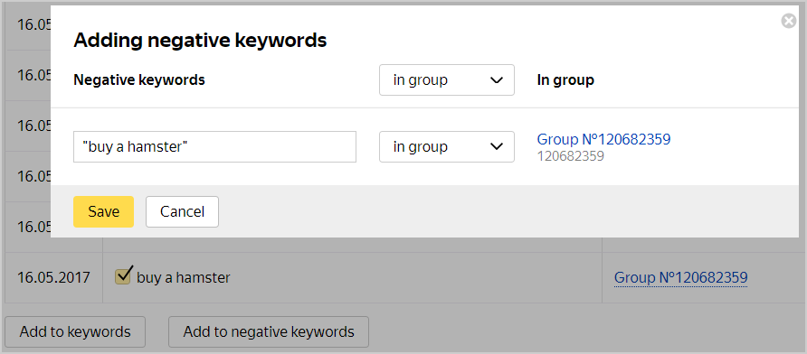In the Adding negative keywords window that appears, you can edit the selected keyword by using the operators +, !, []. By default the added keyword will be specified in inverted commas "". You can select the level for applying the negative keyword, such as at the ad group or campaign level. Click Save.