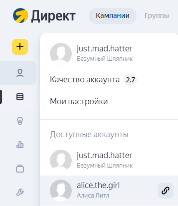 Чтобы переключиться с управляющего аккаунта на подопечный, в меню слева нажмите свой логин и в блоке Доступные аккаунты выберите нужный. Уровень доступа к подопечному аккаунту указан под его названием.