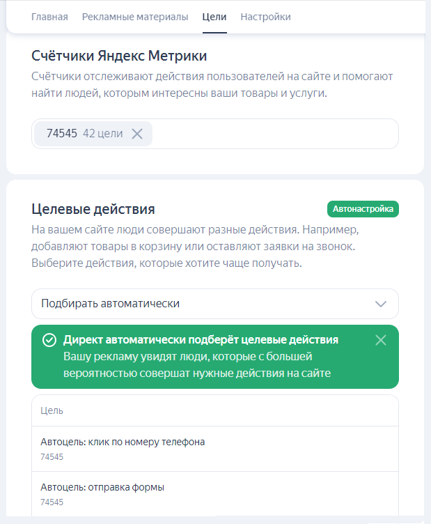 После создания кампании перейдите на вкладку Цели и настройте целевые действия для вашего сайта. Стратегию размещения и цели для профиля организации сервис подбирает автоматически, в интерфейсе они не отображаются.