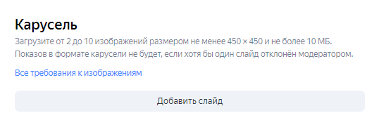 Карусель можно добавить при создании или редактировании объявления в Единой перфоманс-кампании.