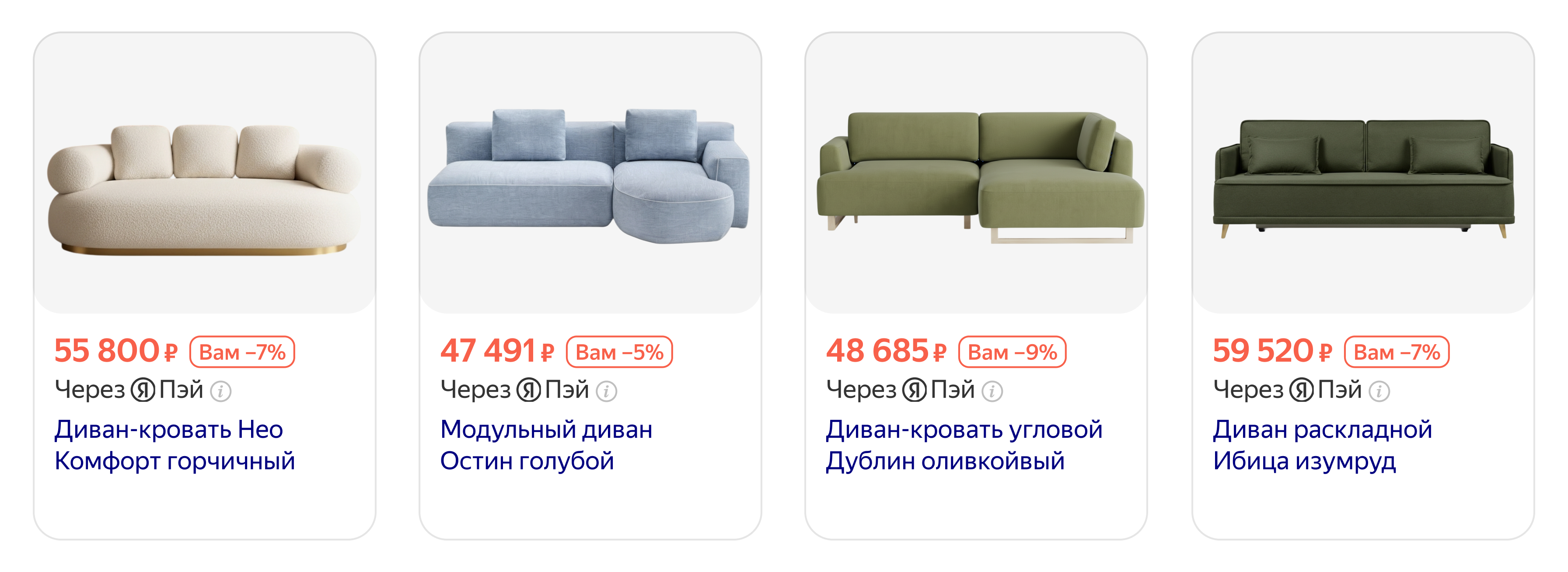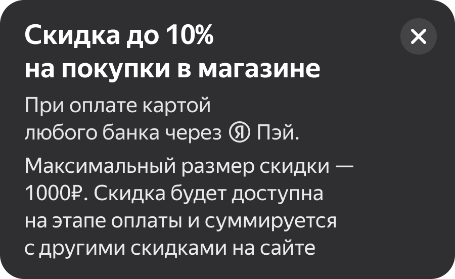Скидкой можно воспользоваться на этапе оплаты заказа любой картой через сервис Яндекс Пэй. Персональную скидку можно применить при покупке любых товаров в магазине, однако ее размер в абсолютном выражении не превысит указанный в объявлении. Пользователь сможет применить только одну персональную скидку в рамках одной покупки.