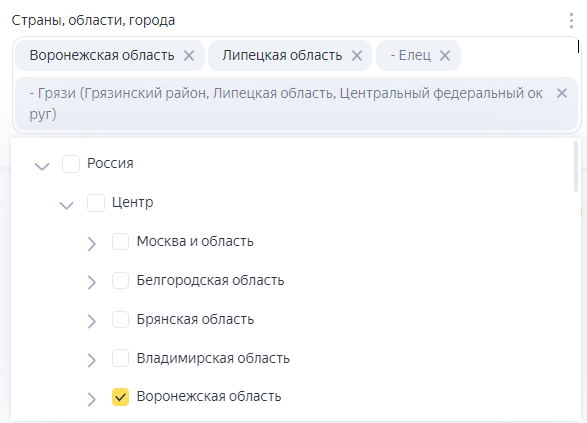Для исключения из показов можно выбрать любой доступный в настройке регион. Он может и не входить в состав указанного региона показа. Например, можно выбрать для показов Липецкую область и исключить из показов Елец и Грязи.