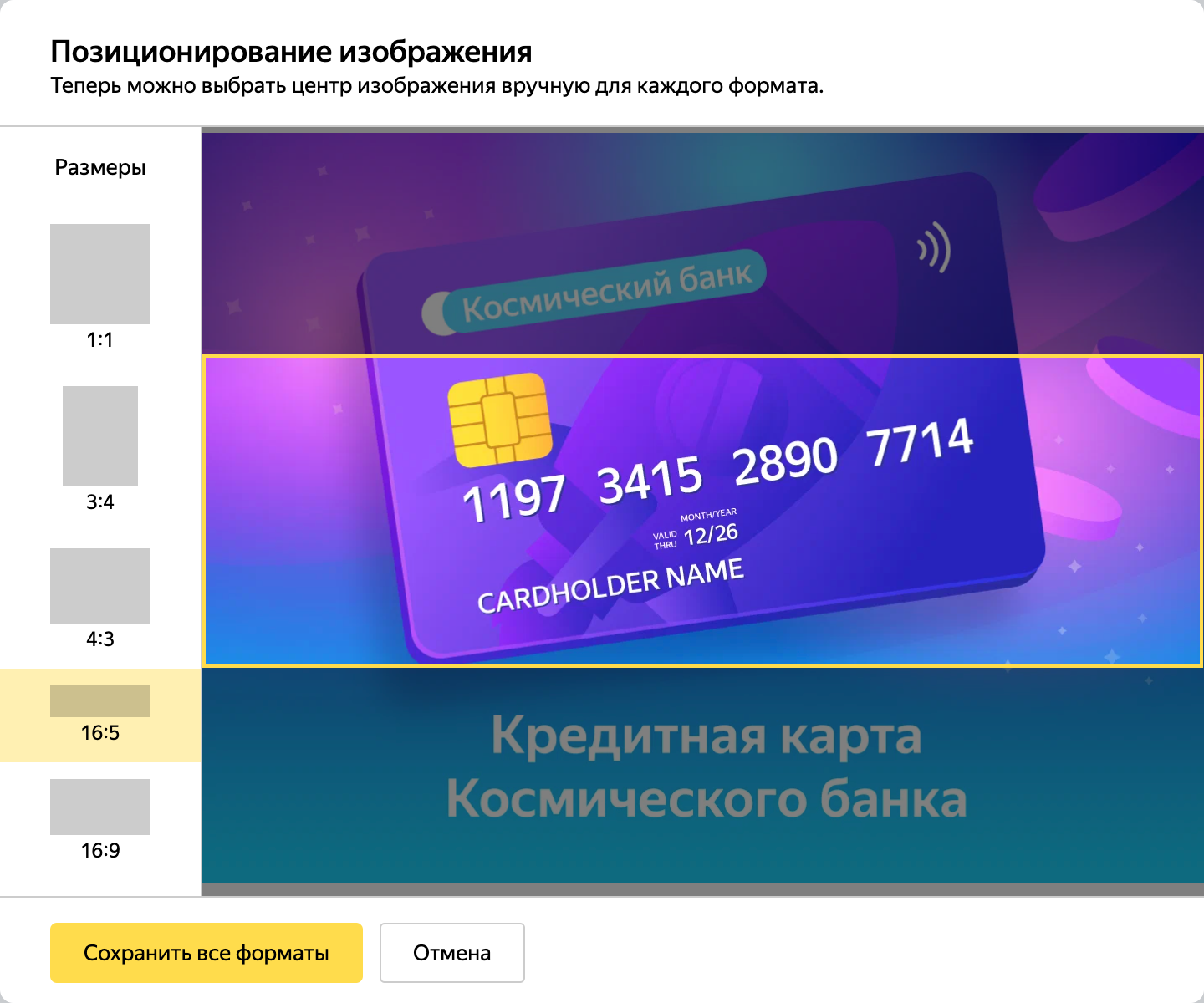 При размещении в рекламном блоке на той или иной площадке изображение может быть уменьшено и обрезано. Если в каком-то из форматов ваше изображение обрезано не так, как вам хотелось бы, задайте смарт-центры вручную.