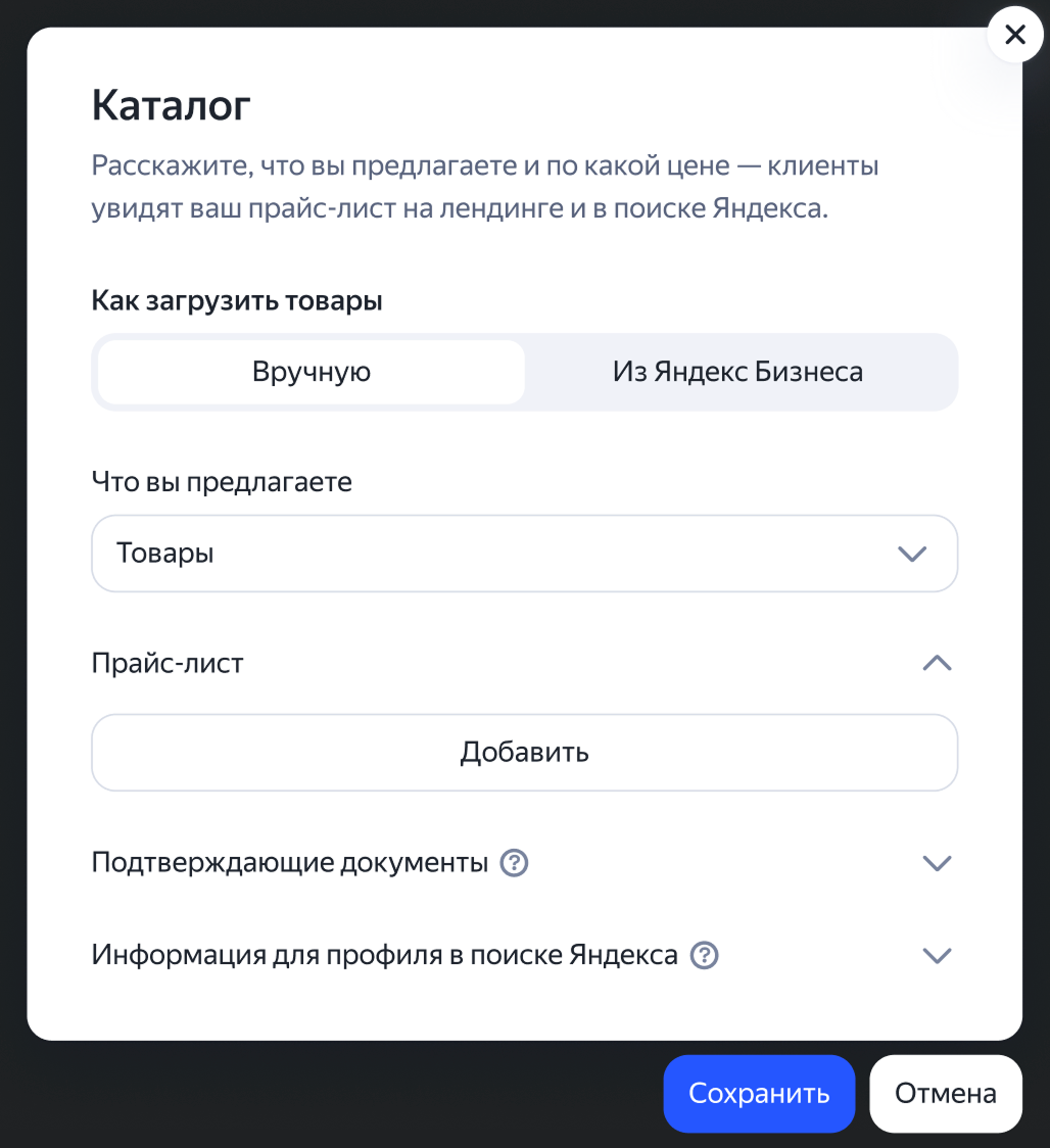 Выберите, как добавить прайс-лист: вручную или из Яндекс Бизнеса.