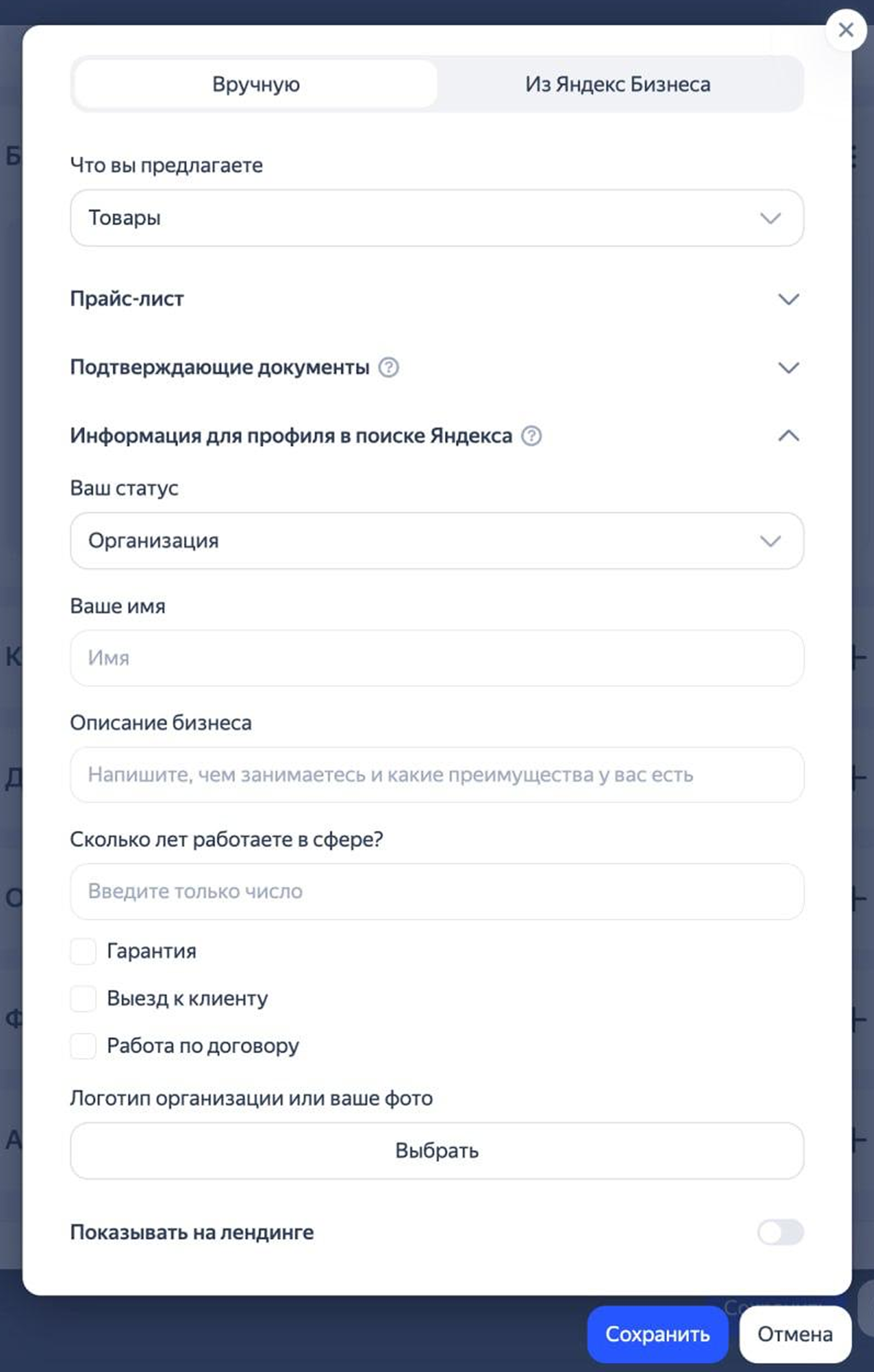 Чтобы ваши объявления продвигались в галерее услуг над результатами поиска, заполните информацию для профиля в поиске Яндекса: укажите ваш статус, имя, стаж работы и добавьте логотип организации или свою фотографию.