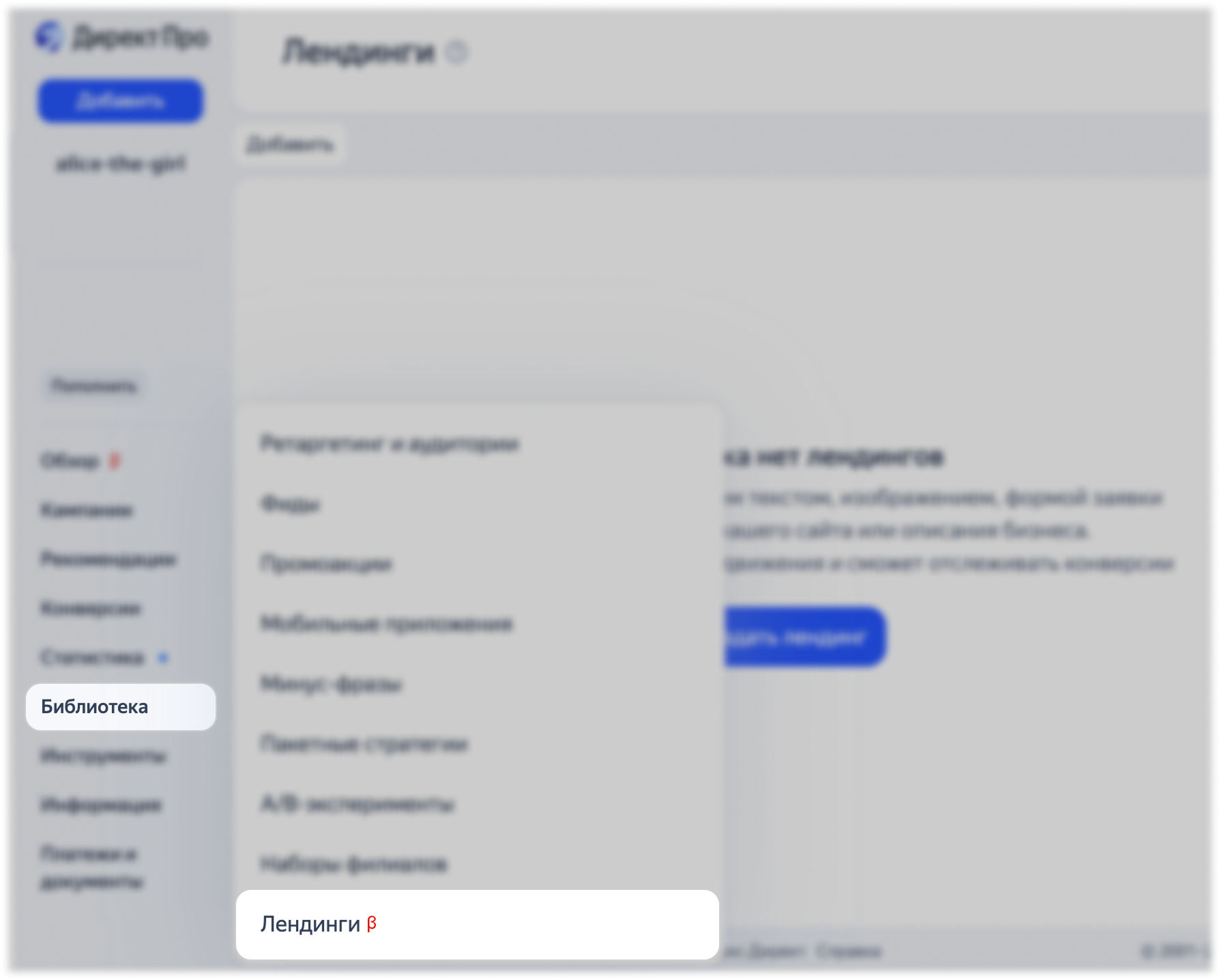 - В интерфейсе Директ Про — в левом меню Библиотека → Лендингиβ.
