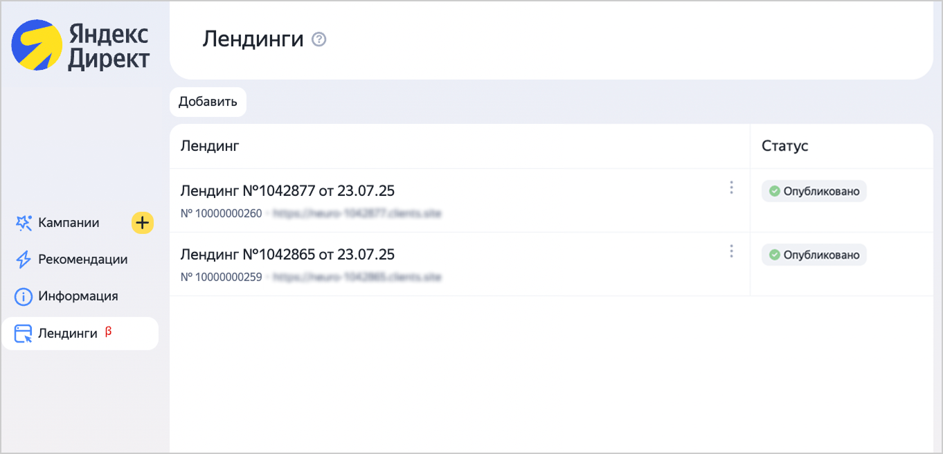 - В интерфейсе Директ — в левом меню в разделе Лендингиβ.