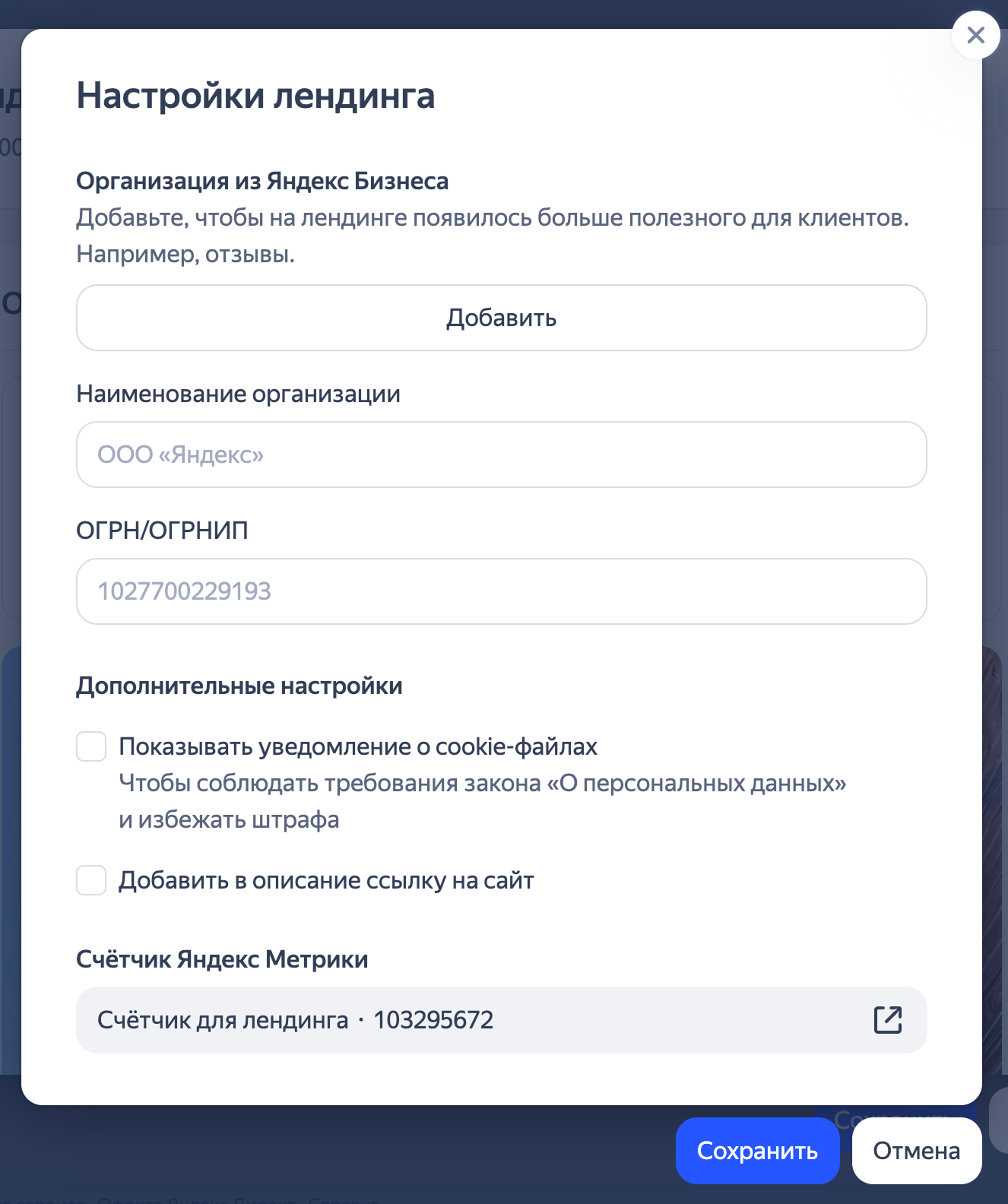 Чтобы добавить на лендинг карту с вашим адресом и отзывы, необходимо привязать организацию из Яндекс Бизнеса. Отзывы отображаются только для офлайн-организаций, которые есть на Яндекс Картах.