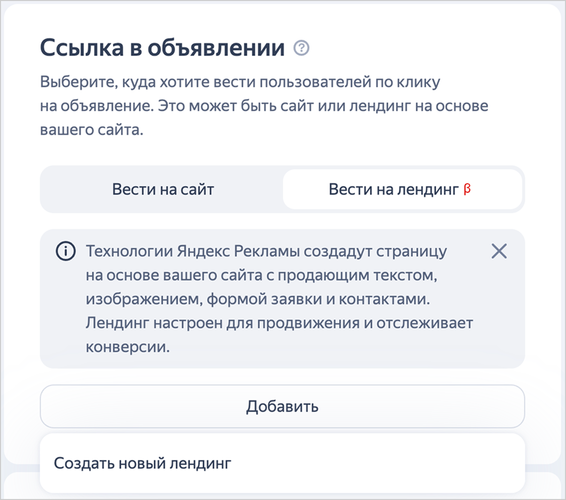 - в Единой перфоманс-кампании — для текстово-графических объявлений можно создать новый лендинг или выбрать существующий;