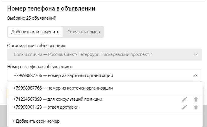 Выберите из списка номеров один из телефонов вашей организации, номер для сбора аналитики или введите телефон вручную. Если в объявлениях используются контакты разных организаций, вы можете указать один из номеров, добавленных вручную.