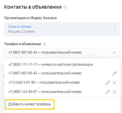 В блоке Контакты в объявлении отредактируйте поле Телефон в объявлении. Вы можете выбрать один из телефонов организации из выпадающего списка или добавить номер вручную. При этом в Яндекс Бизнесе информация не изменится.