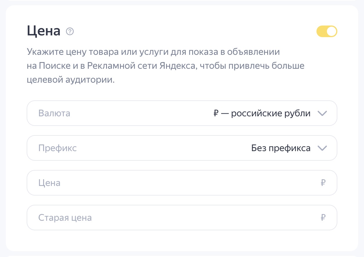В Единой перфоманс-кампании вы можете добавить цену товара или услуги. Указание цены и упоминания о бонусах, специальных предложениях в тексте объявления позволяют привлечь больше целевой аудитории. Также указание цены обязательно для показа текстово-графических объявлений в товарной галерее.