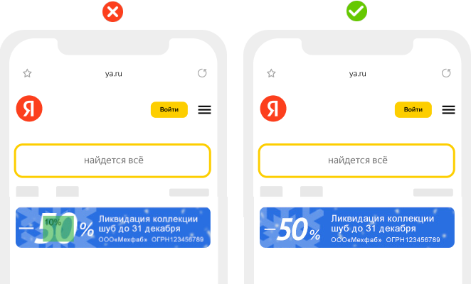 Обязательная правовая информация (например, название банка и ОПФ, сроки акции и т. д.) должна быть четко видна сразу, без взаимодействия пользователя с баннером. Подробнее смотрите в дополнительных рекомендациях.