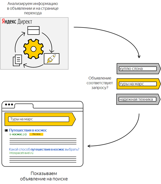 Например, объявление с текстом про путешествия в космос и продвигаемой страницей в-космос.рф может быть показано по запросу туры на марс.