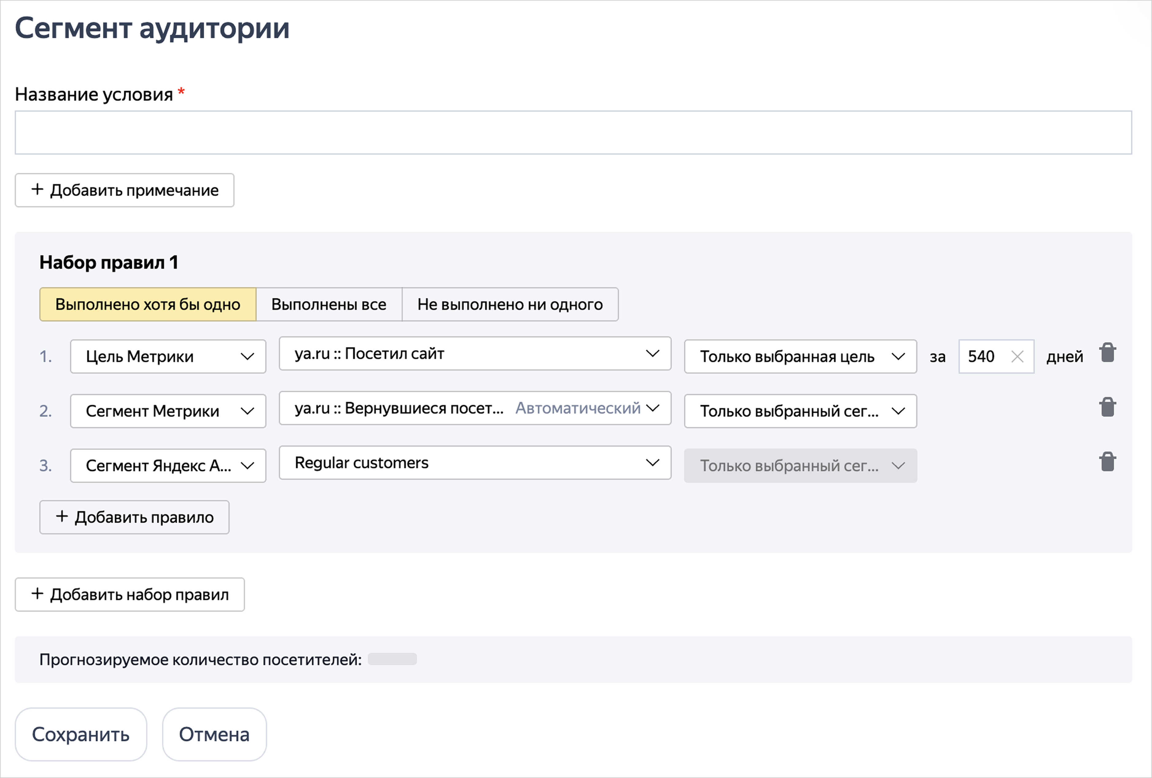 Всего можно добавить не более 250 правил. Помните, чем больше правил в условии формирования сегмента, тем меньше охват аудитории.