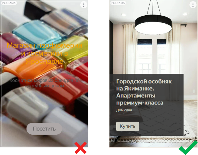 Элементы интерфейса на изображении должны соответствовать переходу на сайт или запуску приложения. Это может быть кнопка с текстом «подробнее», «заказать», «купить». Не добавляйте элементы интерфейса, которые могут ввести пользователя в заблуждение и не приводят к желаемому результату. Например, кнопки для воспроизведения видео или закрытия окна.