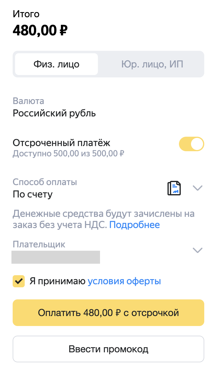 Чтобы изменить плательщика в счете с отсрочкой платежа, напишите в отдел клиентского сервиса.