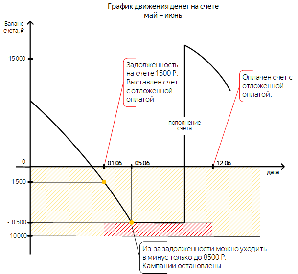 Если через 15 дней оплата по счету с отсрочкой платежа не поступила, задолженность считается просроченной. Ваши кампании могут быть заблокированы.