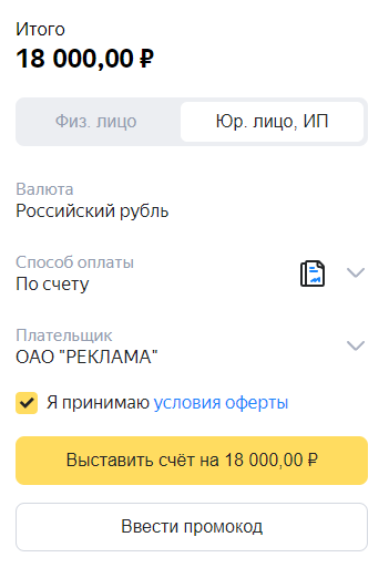 В следующем окне выберите способ оплаты По счету → Выставить счет.