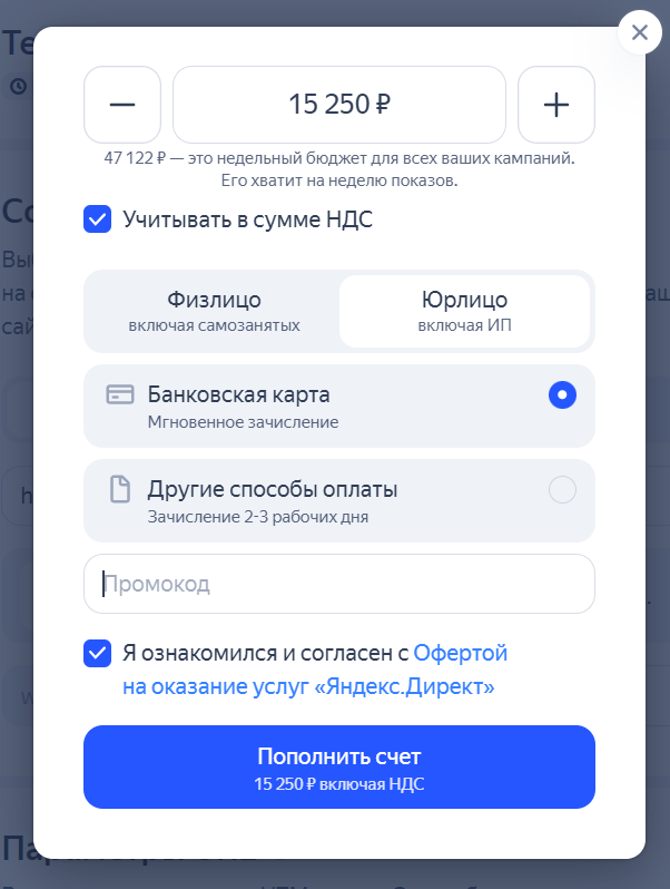 На странице пополнения счета введите сумму бюджета кампании. Сумма (без учета НДС) должна быть не меньше суммы, указанной в условиях акции.