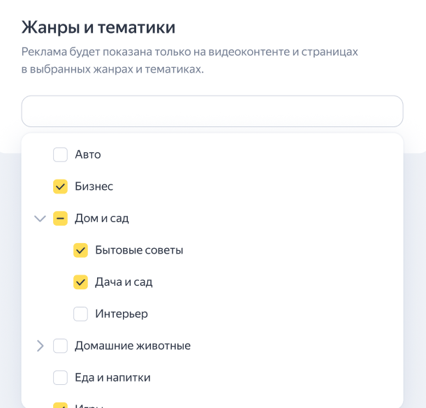 Включить показы по жанрам и тематикам можно при создании группы объявлений. В блоке Условия показа перейдите на вкладку Жанры и тематики и выберите нужные таргетинги. Укажите не менее трех жанров или тематик, чтобы охват не был слишком низким.