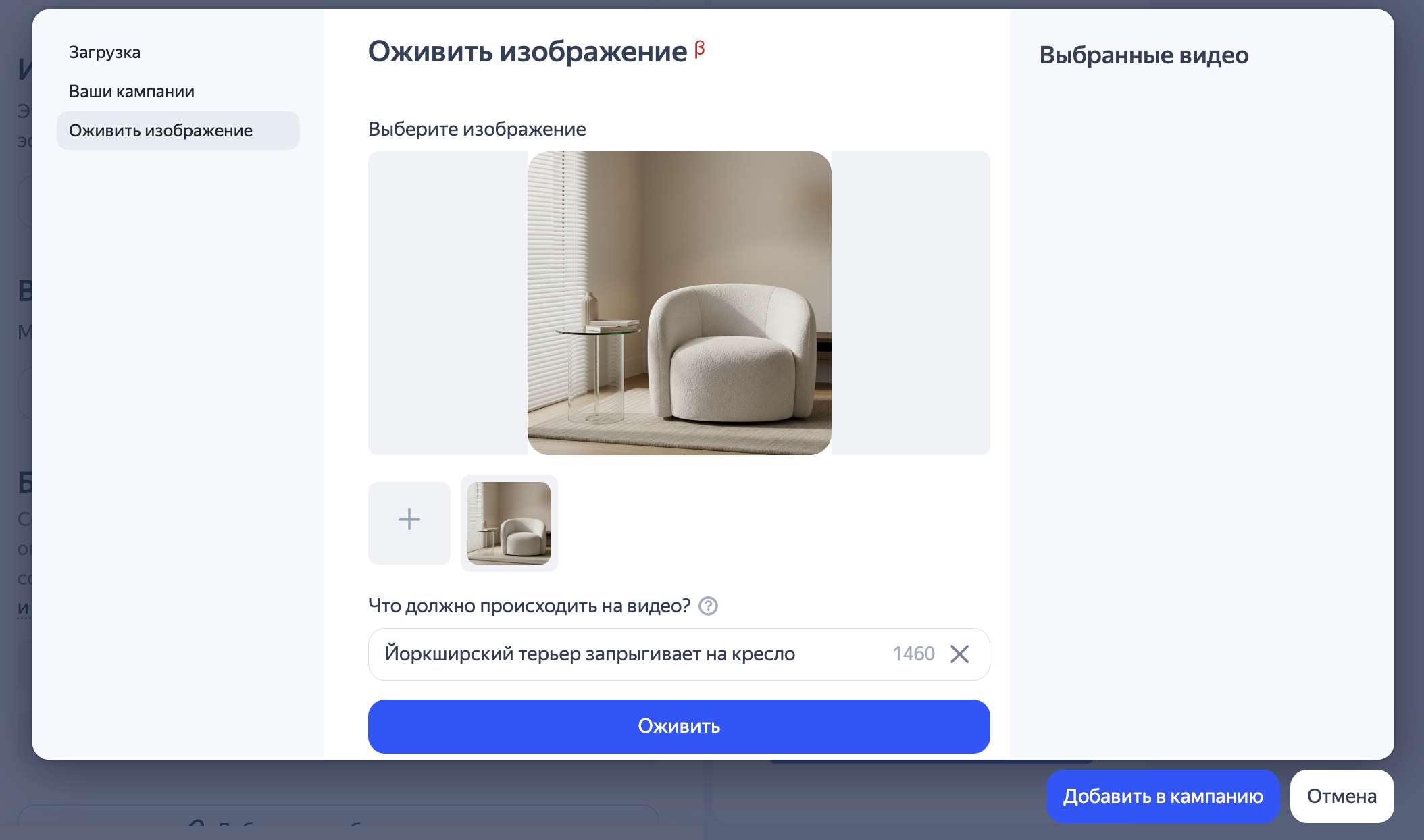 Опишите, что должно происходить на видео: например, «Йоркширский терьер запрыгивает на кресло», и нажмите Оживить. На основе изображения будет сгенерировано видео длительностью 5 секунд.