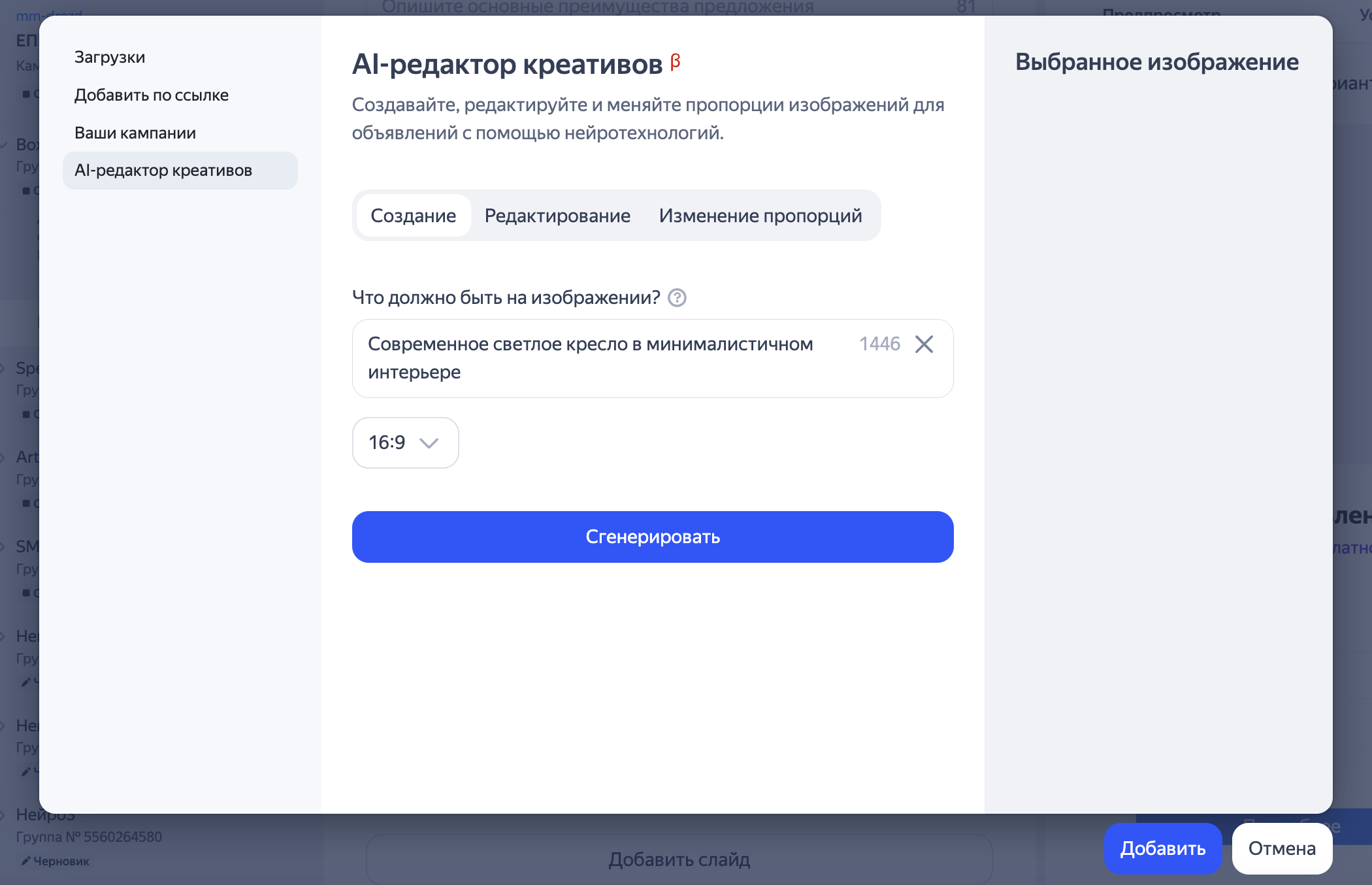 На вкладке Создание опишите изображение, которое нужно сгенерировать: введите описание ключевого объекта и его окружения. Например, «Современное светлое кресло в минималистичном интерьере».