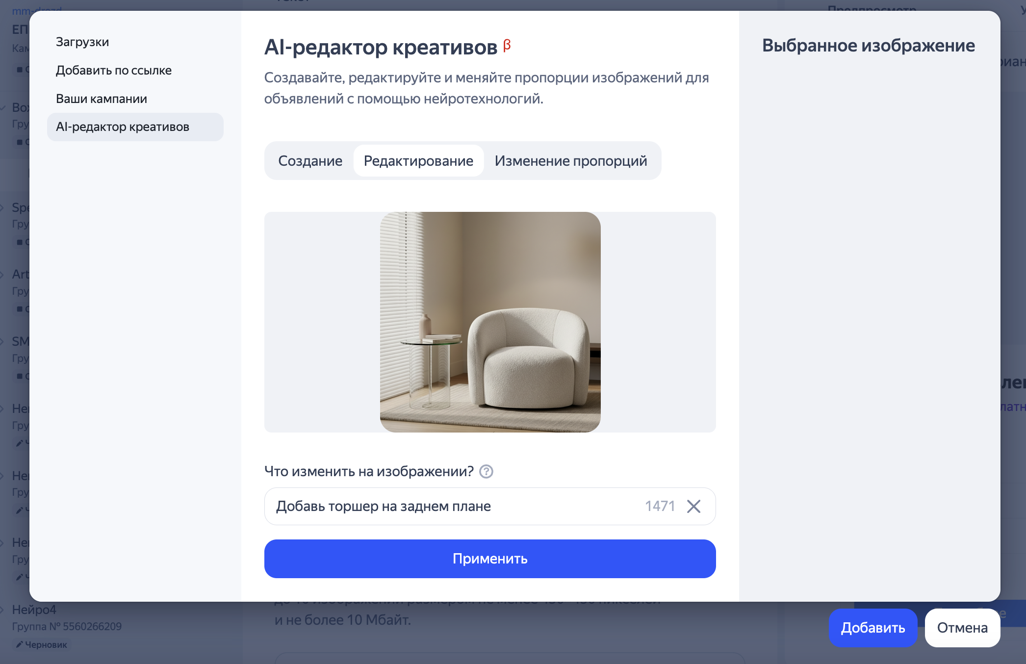 Напишите, что необходимо изменить: например, «Добавь торшер на заднем плане», и нажмите Применить. Редактор заменит или скорректирует указанные элементы, при этом он будет стремиться сохранить общую композицию и стиль исходного изображения.