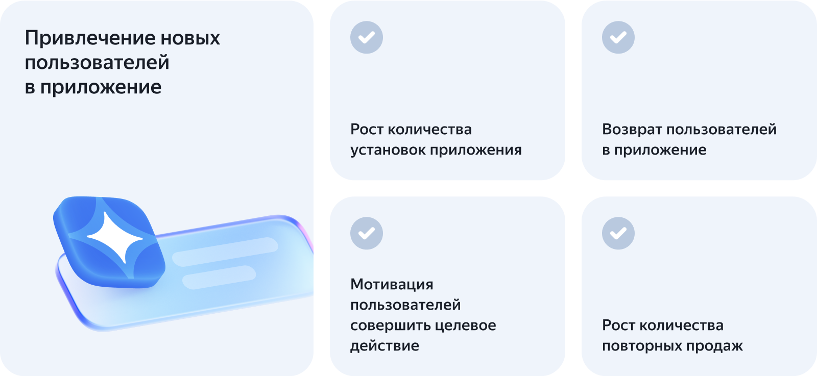 Продвижение приложений — инструмент Директа, который позволяет продвигать iOS и Android приложения. С его помощью бизнесы, разработчики и паблишеры могут привлечь новых пользователей или вернуть тех, кто давно не заходил в приложение.